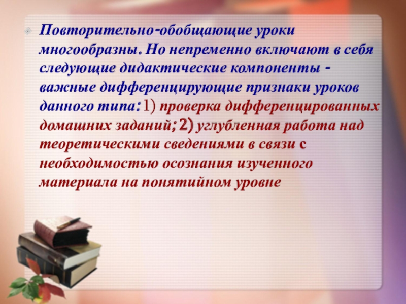 Слайд 9Повторительно-обобщающие уроки многообразны. Но непременно включают в себя следующие дидактические компоненты