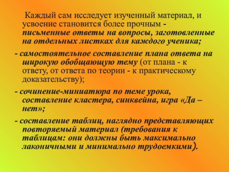 Слайд 16 Каждый сам исследует изученный материал, и усвоение становится
