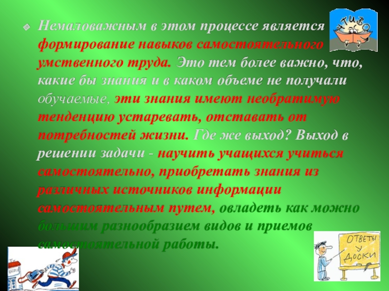 Немаловажным в этом процессе является формирование навыков самостоятельного умственного труда. Это