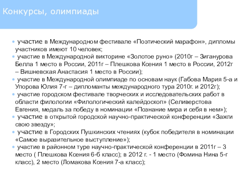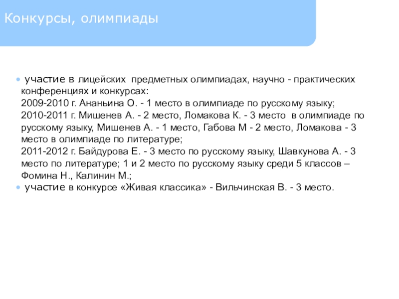 2010-2011 г. Мишенев А. - 2 место, Ломакова К. - 3 место в олимпиаде по русскому языку, Мишенев А. - 1 место, Габова М - 2 место, Ломакова - 3 место в олимпиаде по литературе;