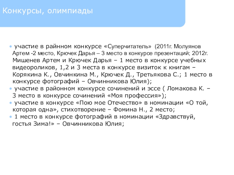 участие в райнном конкурсе «Суперчитатель» (2011г. Молуянов Артем -2 место, Крючек Дарья – 3 место в конкурсе презентаций; 2012г. Мишенев Артем и Крючек Дарья – 1 место в конкурсе учебных видеороликов, 1,2 и 3 места в конкурсе визиток к книгам – Корякина К., Овчинкина М., Крючек Д., Третьякова С.; 1 место в конкурсе фотографий – Овчинникова Юлия);