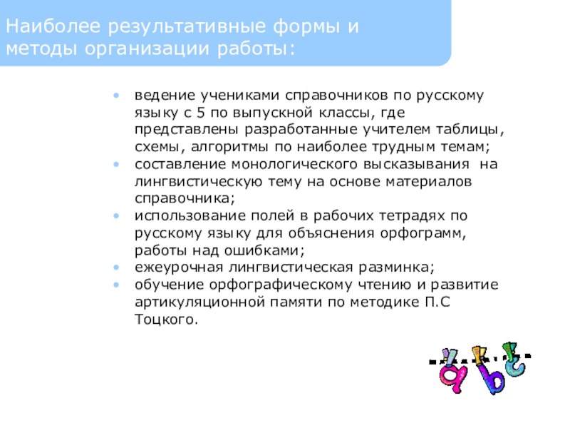 ведение учениками справочников по русскому языку с 5 по выпускной классы, где представлены разработанные учителем таблицы, схемы, алгоритмы по наиболее трудным темам;