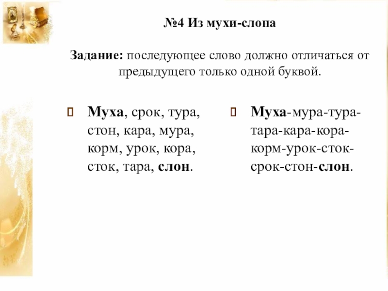 Муха-мура-тура-тара-кара-кора-корм-урок-сток-срок-стон-слон.