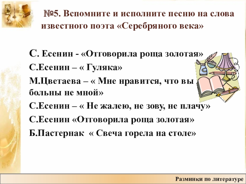 №5. Вспомните и исполните песню на слова известного поэта «Серебряного века»