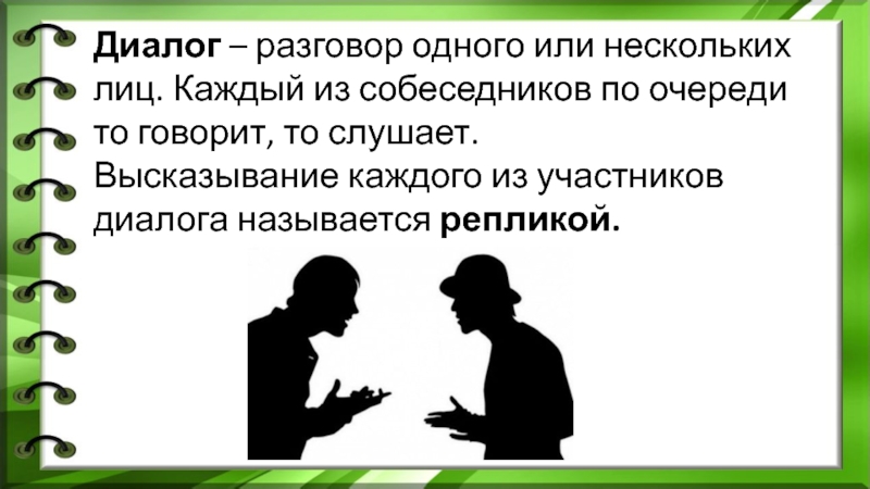 Диалог – разговор одного или нескольких лиц. Каждый из собеседников по очереди то говорит, то слушает.Высказывание каждого