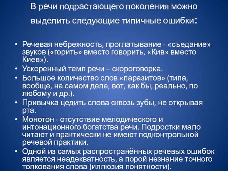 Слайд 6В речи подрастающего поколения можно выделить следующие типичные ошибки: