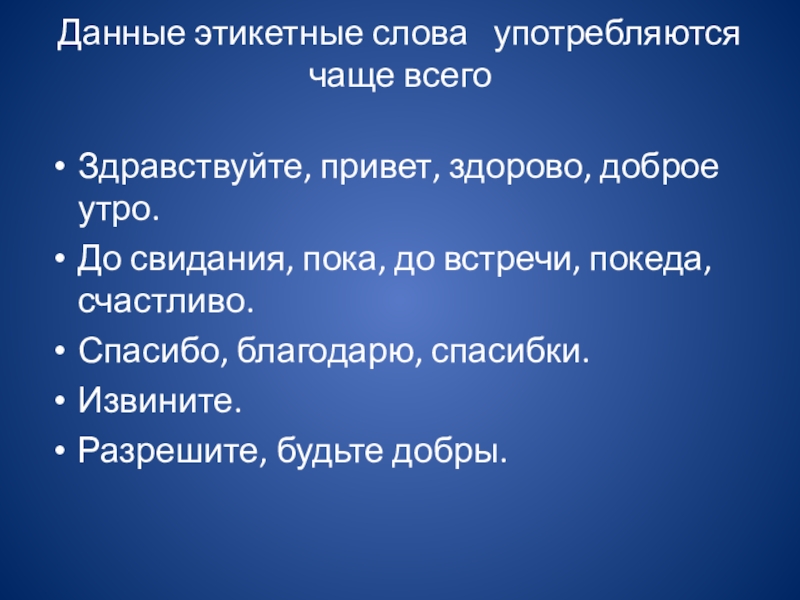 Слайд 17Данные этикетные слова употребляются чаще всего