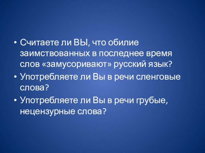 Слайд 13Считаете ли ВЫ, что обилие заимствованных в последнее время слов «замусоривают»