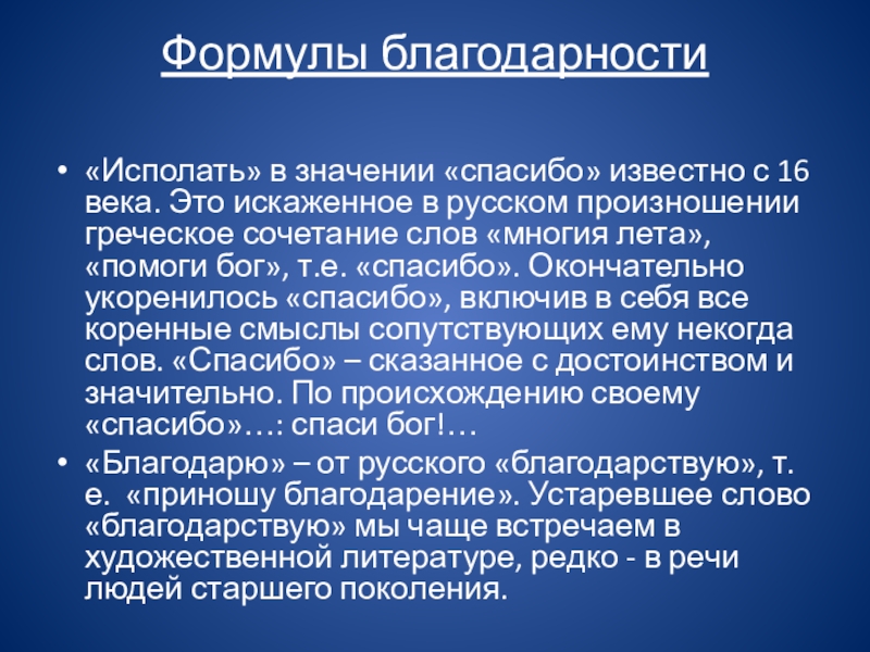 искаженное в русском произношении греческое сочетание слов «многия лета», «помоги бог», т.е. «спасибо». Окончательно укоренилось «спасибо», включив в себя все коренные смыслы сопутствующих ему некогда слов. «Спасибо» – сказанное с достоинством и значительно. По происхождению своему «спасибо»…: спаси бог!…