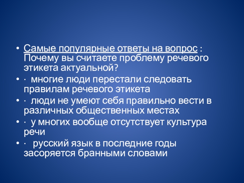 Слайд 15Самые популярные ответы на вопрос :Почему вы считаете проблему речевого этикета