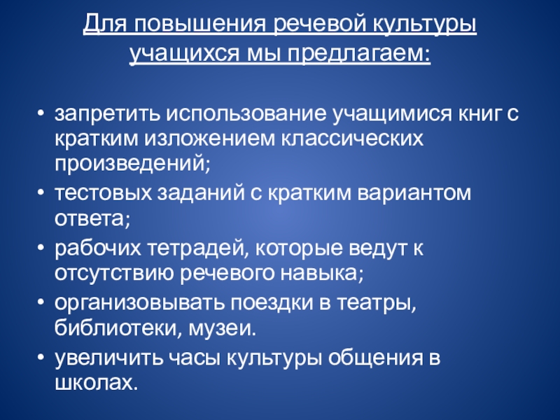 Слайд 20Для повышения речевой культуры учащихся мы предлагаем: