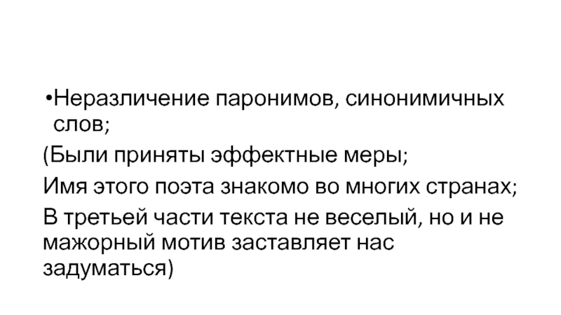 Неразличение паронимов, синонимичных слов;(Были приняты эффектные меры; Имя этого поэта знакомо во многих странах; В третьей части