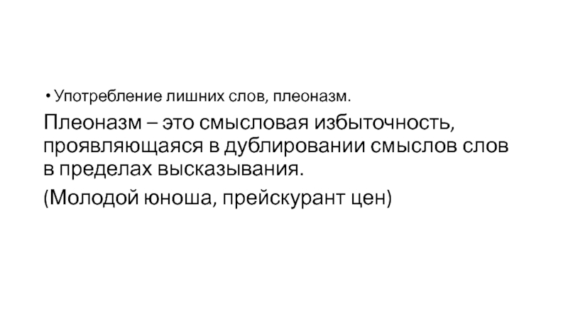 Употребление лишних слов, плеоназм.Плеоназм – это смысловая избыточность, проявляющаяся в дублировании смыслов слов в пределах высказывания.(Молодой юноша,