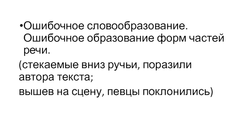 Ошибочное словообразование. Ошибочное образование форм частей речи.(стекаемые вниз ручьи, поразили автора текста; вышев на сцену, певцы поклонились)