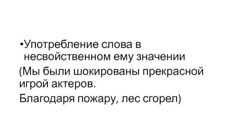 Употребление слова в несвойственном ему значении(Мы были шокированы прекрасной игрой актеров. Благодаря пожару, лес сгорел)