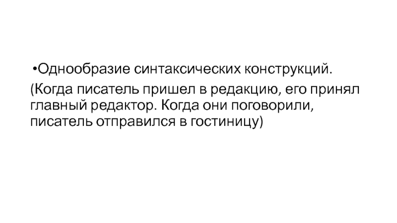 Однообразие синтаксических конструкций.(Когда писатель пришел в редакцию, его принял главный редактор. Когда они поговорили, писатель отправился в
