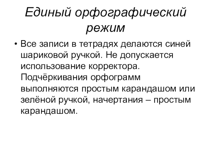 Единый орфографический режимВсе записи в тетрадях делаются синей шариковой ручкой. Не допускается использование корректора. Подчёркивания орфограмм выполняются