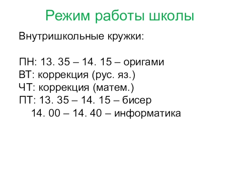 Режим работы школы  Внутришкольные кружки:  ПН: 13. 35 – 14. 15 – оригами ВТ: коррекция