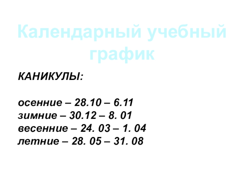 Календарный учебный графикКАНИКУЛЫ: осенние – 28.10 – 6.11 зимние – 30.12 – 8. 01 весенние – 24. 03 – 1. 04 летние – 28. 05 – 31. 08
