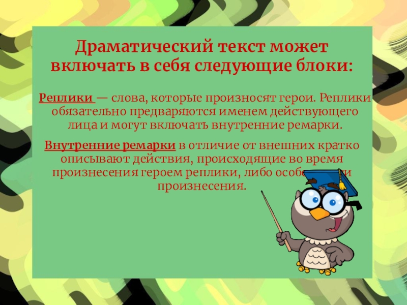 Внутренние ремарки в отличие от внешних кратко описывают действия, происходящие во время произнесения героем реплики, либо особенности произнесения.
