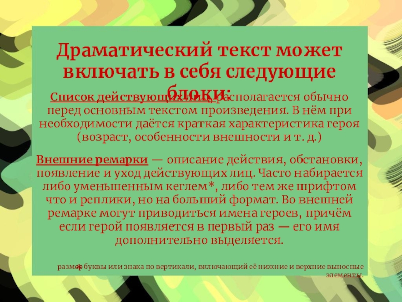 Внешние ремарки — описание действия, обстановки, появление и уход действующих лиц. Часто набирается либо уменьшенным кеглем*, либо тем же шрифтом что и реплики, но на больший формат. Во внешней ремарке могут приводиться имена героев, причём если герой появляется в первый раз — его имя дополнительно выделяется.