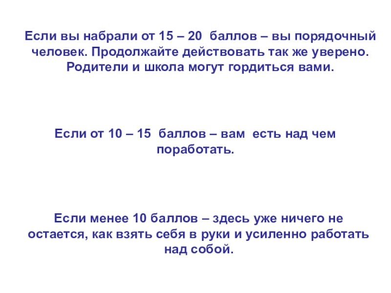 Если менее 10 баллов – здесь уже ничего не остается, как взять себя в руки и усиленно работать над собой.