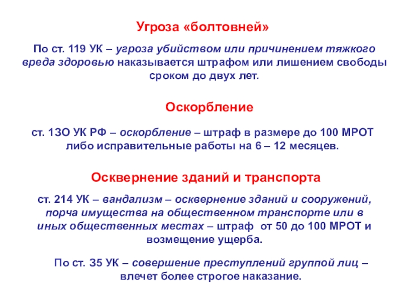 ст. 1ЗО УК РФ – оскорбление – штраф в размере до 100 МРОТ либо исправительные работы на 6 – 12 месяцев.