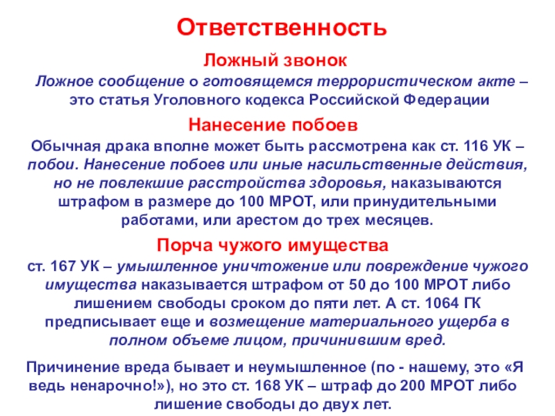 Причинение вреда бывает и неумышленное (по - нашему, это «Я ведь ненарочно!»), но это ст. 168 УК – штраф до 200 МРОТ либо лишение свободы до двух лет.