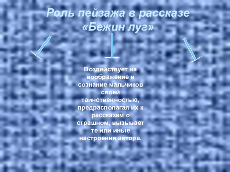 Роль пейзажа в рассказе «Бежин луг»Воздействует на воображение и сознание мальчиков своей таинственностью, предрасполагая их к рассказам