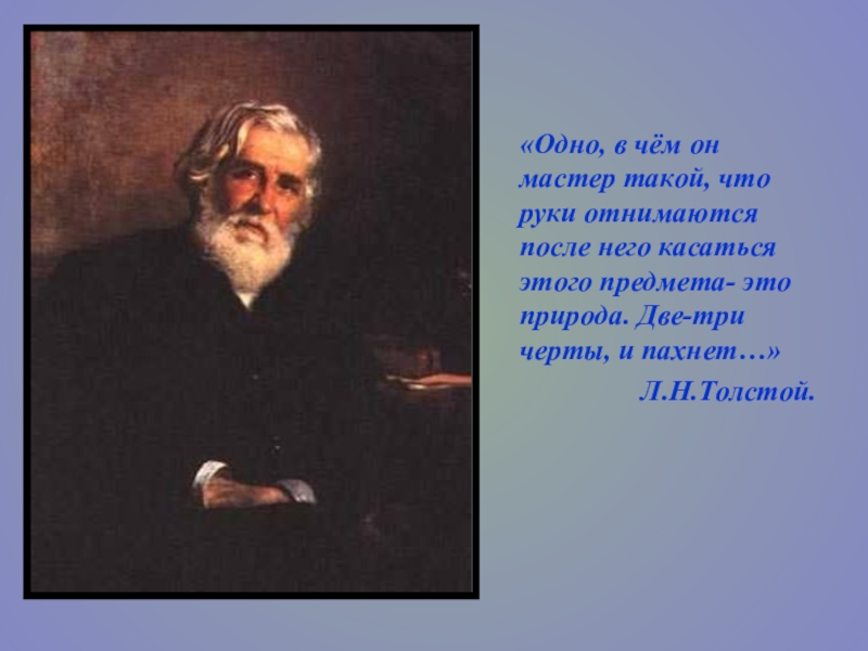 «Одно, в чём он мастер такой, что руки отнимаются после него касаться этого предмета- это природа. Две-три черты, и пахнет…»Л.Н.Толстой.