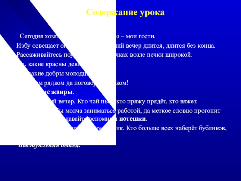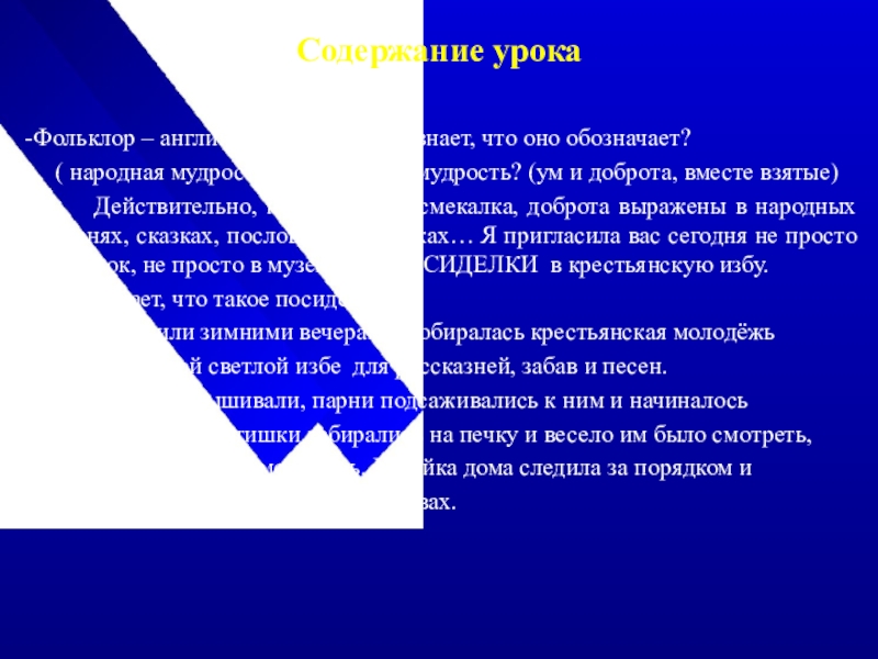 Действительно, народный ум, смекалка, доброта выражены в народных песнях, сказках, пословицах, загадках… Я пригласила вас сегодня не просто на урок, не просто в музей, а на ПОСИДЕЛКИ в крестьянскую избу.