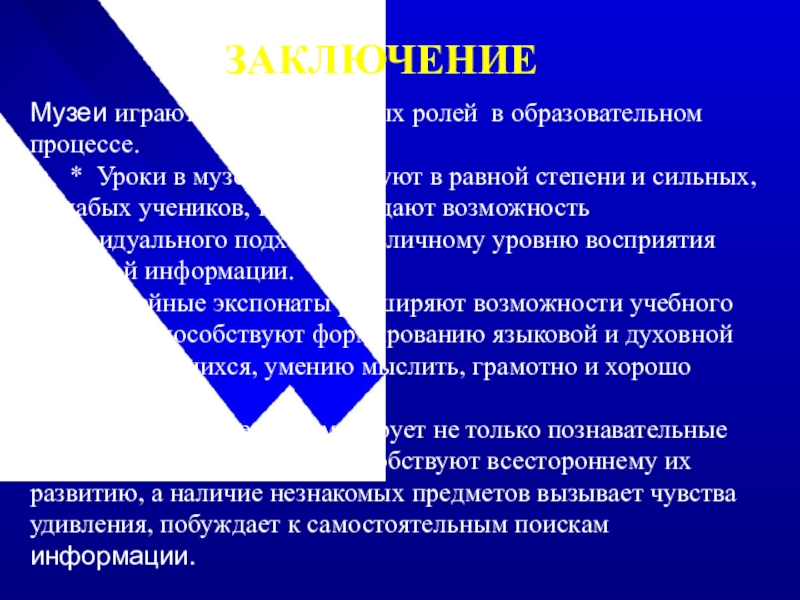 * Уроки в музее активизируют в равной степени и сильных, и слабых учеников, так как создают возможность индивидуального подхода к различному уровню восприятия музейной информации.