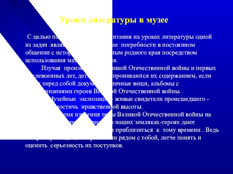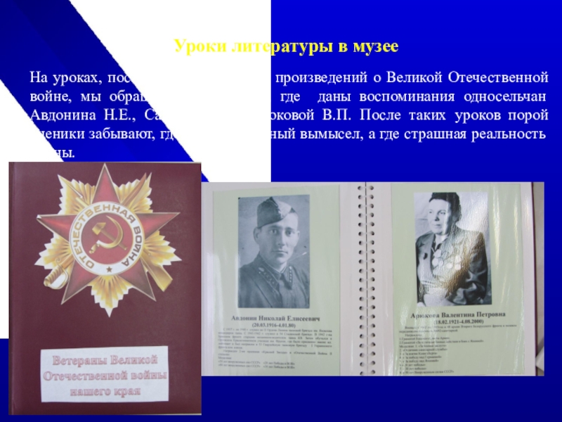 Изучая произведения Великой Отечественной войны и первых послевоенных лет, дети глубже проникаются их содержанием, если видят перед собой документы, личные вещи, альбомы с воспоминаниями героев Великой Отечественной войны.
