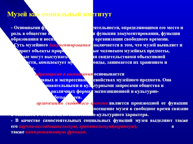 - Основными функциями музейной деятельности, определяющими его место и