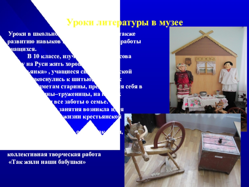 В 10 классе, изучая поэму Некрасова «Кому на Руси жить хорошо» главу «Крестьянка» , учащиеся сидели в «Русской избе», прикоснулись к шитью, прялке, к другим предметам старины, представляя себя в образе женщины–труженицы, на плечах которой лежали все заботы о семье.