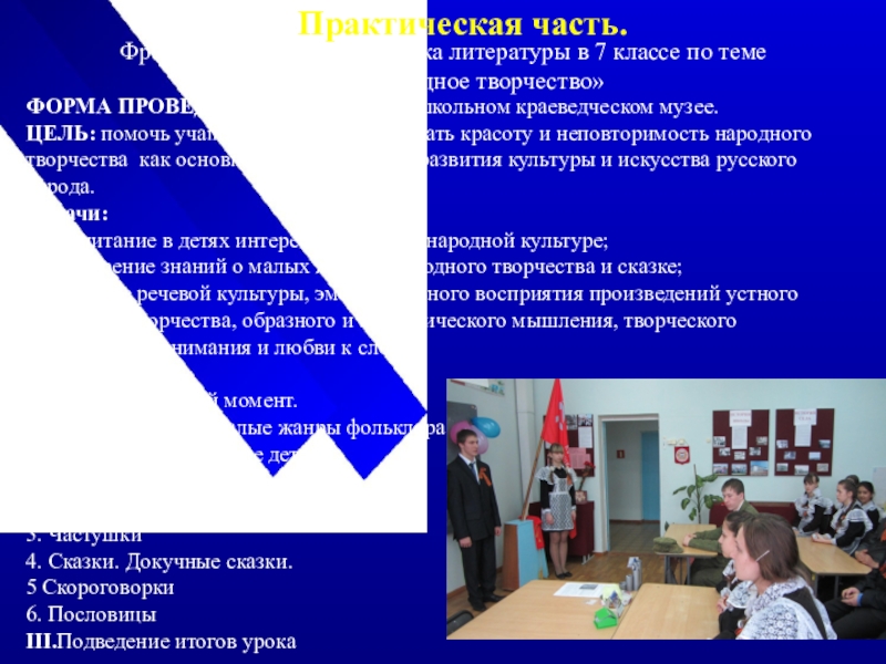 посвященные изучению устного народного творчества , где учащиеся, сидя на лавке за столом, детально изучают внутренний интерьер и убранство крестьянского жилища.