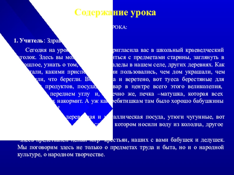 Сегодня на урок литературы я пригласила вас в школьный краеведческий уголок. Здесь вы можете познакомиться с предметами старины, заглянуть в прошлое, узнать о том, как жили прадеды в нашем селе, других деревнях. Как работали, какими приспособлениями пользовались, чем дом украшали, чем дорожили, что берегли. Вот прялка и веретено, вот туеса берестяные для хранения продуктов, посуда, самовар в центре всего этого великолепия, божница в переднем углу и, конечно же, печка –матушка, которая всех согреет и всех накормит. А уж как ребятишкам там было хорошо бабушкины сказки слушать!