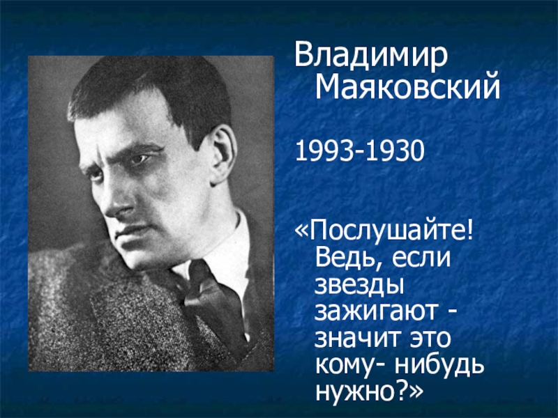 Владимир Маяковский1993-1930«Послушайте! Ведь, если звезды зажигают - значит это кому- нибудь нужно?»