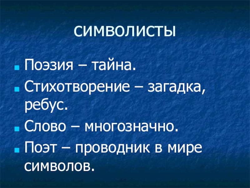 символистыПоэзия – тайна.Стихотворение – загадка, ребус.Слово – многозначно.Поэт – проводник в мире символов.