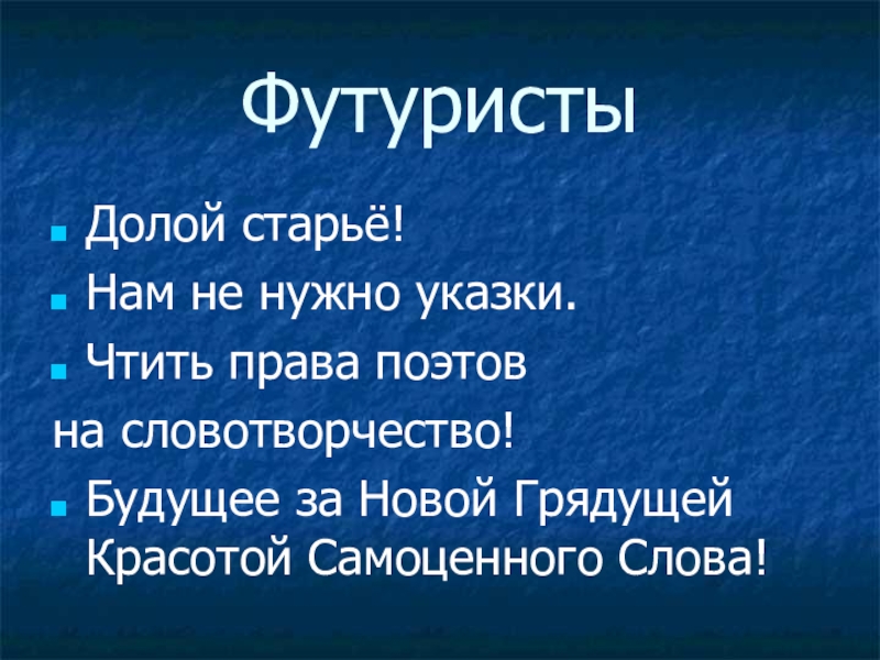 ФутуристыДолой старьё!Нам не нужно указки.Чтить права поэтов на словотворчество!Будущее за Новой Грядущей Красотой Самоценного Слова!