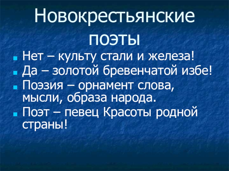 Новокрестьянские поэтыНет – культу стали и железа!Да – золотой бревенчатой избе!Поэзия – орнамент слова, мысли, образа народа.Поэт