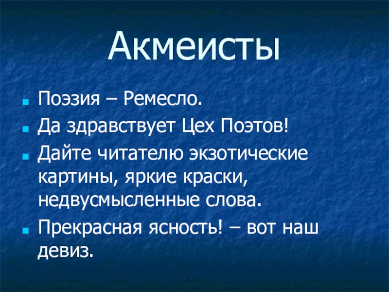 АкмеистыПоэзия – Ремесло.Да здравствует Цех Поэтов!Дайте читателю экзотические картины, яркие краски, недвусмысленные слова.Прекрасная ясность! – вот наш