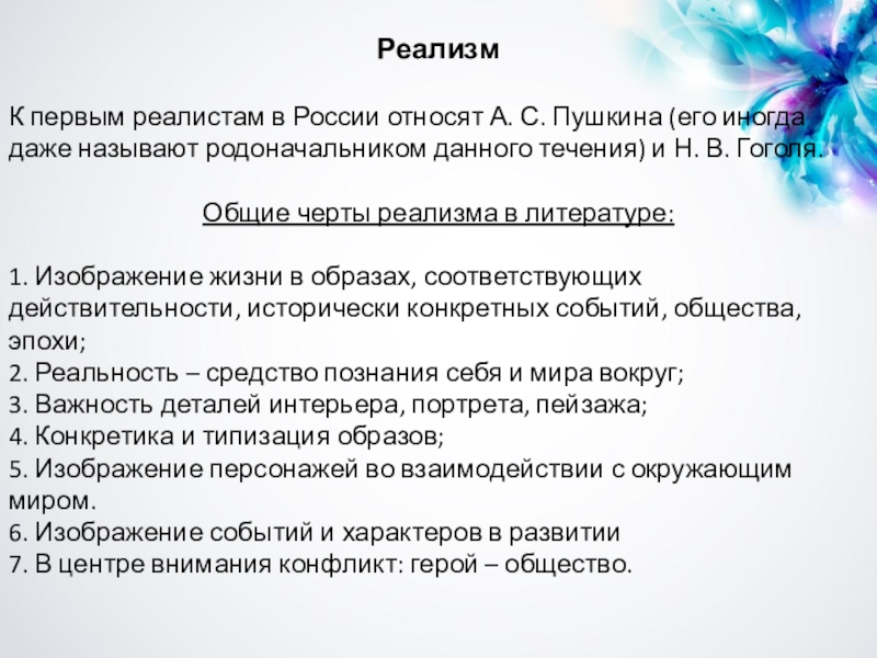 1. Изображение жизни в образах, соответствующих действительности, исторически конкретных событий, общества, эпохи;