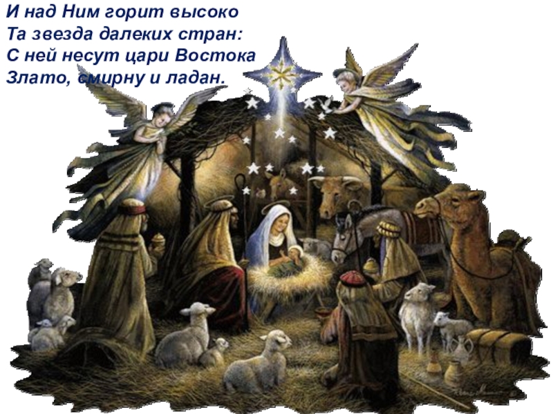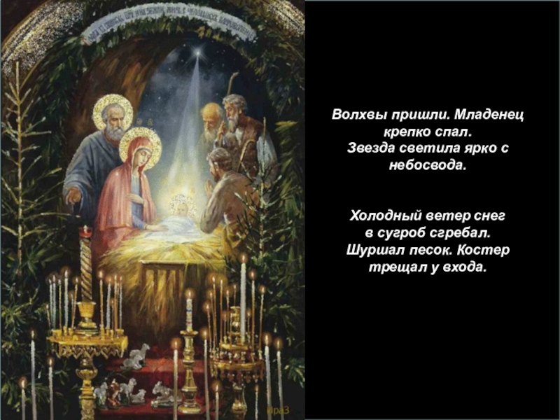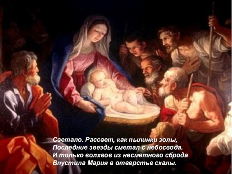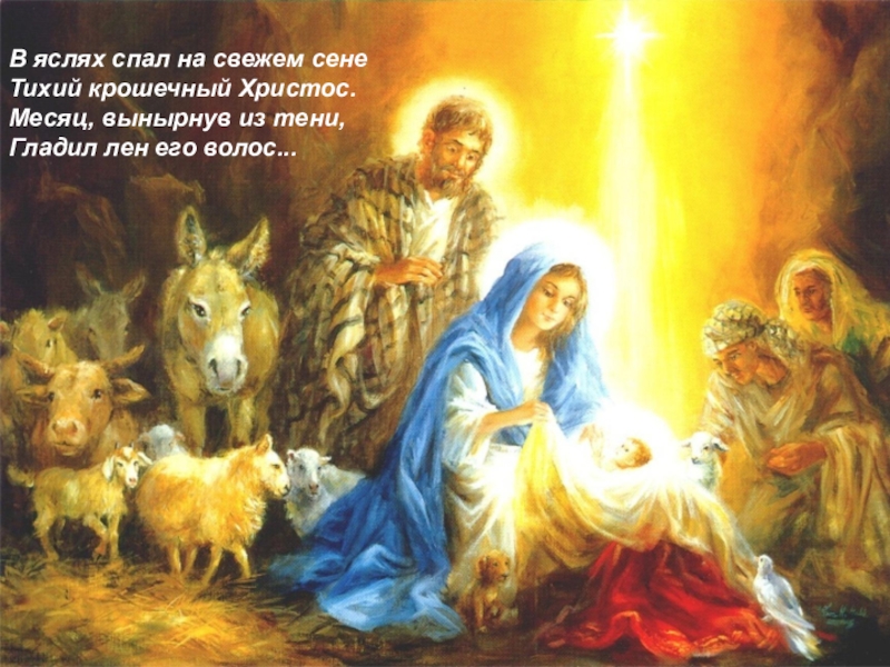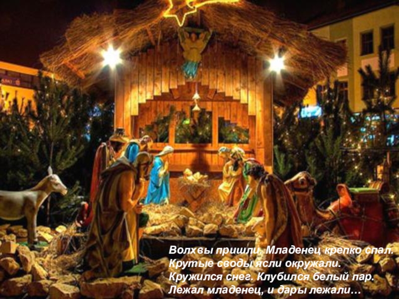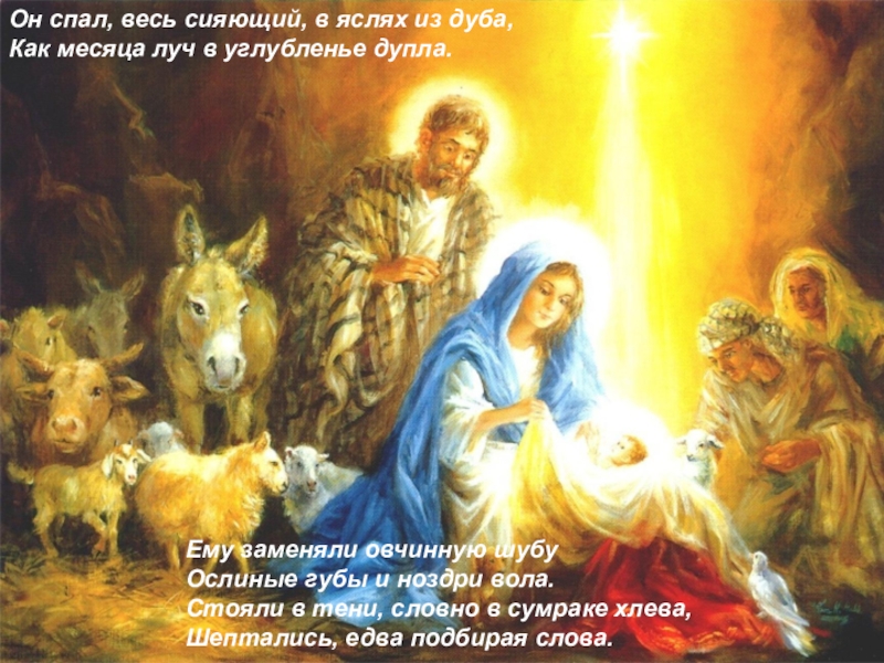 Слайд 57Он спал, весь сияющий, в яслях из дуба,