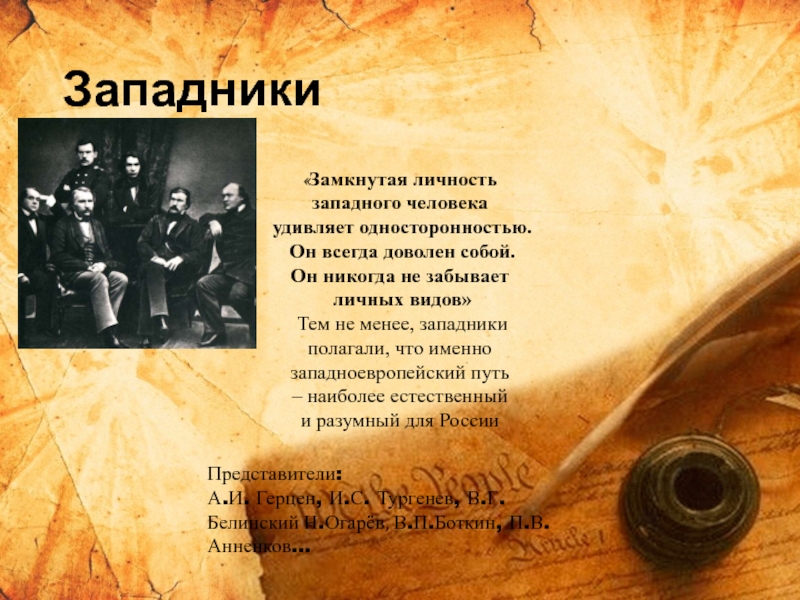 А.И. Герцен, И.С. Тургенев, В.Г. Белинский Н.Огарёв, В.П.Боткин, П.В.Анненков…