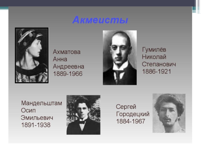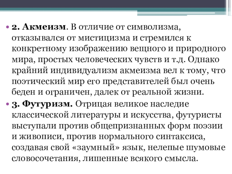к конкретному изображению вещного и природного мира, простых человеческих чувств и т.д. Однако крайний индивидуализм акмеизма вел к тому, что поэтический мир его представителей был очень беден и ограничен, далек от реальной жизни.