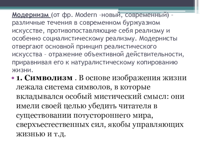 буржуазном искусстве, противопоставляющие себя реализму и особенно социалистическому реализму. Модернисты отвергают основной принцип реалистического искусства – отражение объективной действительности, приравнивая его к натуралистическому копированию жизни.