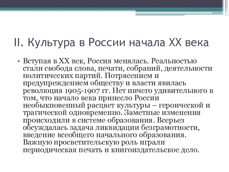 менялась. Реальностью стали свобода слова, печати, собраний, деятельности политических партий. Потрясением и предупреждением обществу и власти явилась революция 1905-1907 гг. Нет ничего удивительного в том, что начало века принесло России необыкновенный расцвет культуры – героической и трагической одновременно. Заметные изменения происходили в системе образования. Всерьез обсуждалась задача ликвидации безграмотности, введение всеобщего начального образования. Важную просветительскую роль играли периодическая печать и книгоиздательское дело.