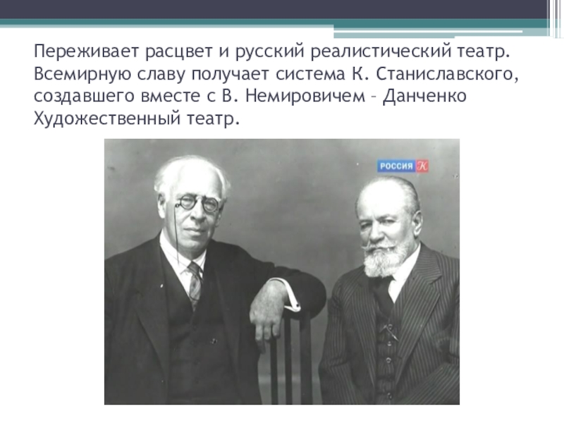 Слайд 26Переживает расцвет и русский реалистический театр. Всемирную славу получает система К.