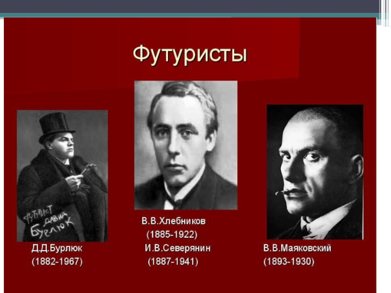 3. Футуризм. Отрицая великое наследие классической литературы и искусства, футуристы выступали против общепризнанных форм поэзии и живописи, против нормального синтаксиса, создавая свой «заумный» язык, нелепые шумовые словосочетания, лишенные всякого смысла.